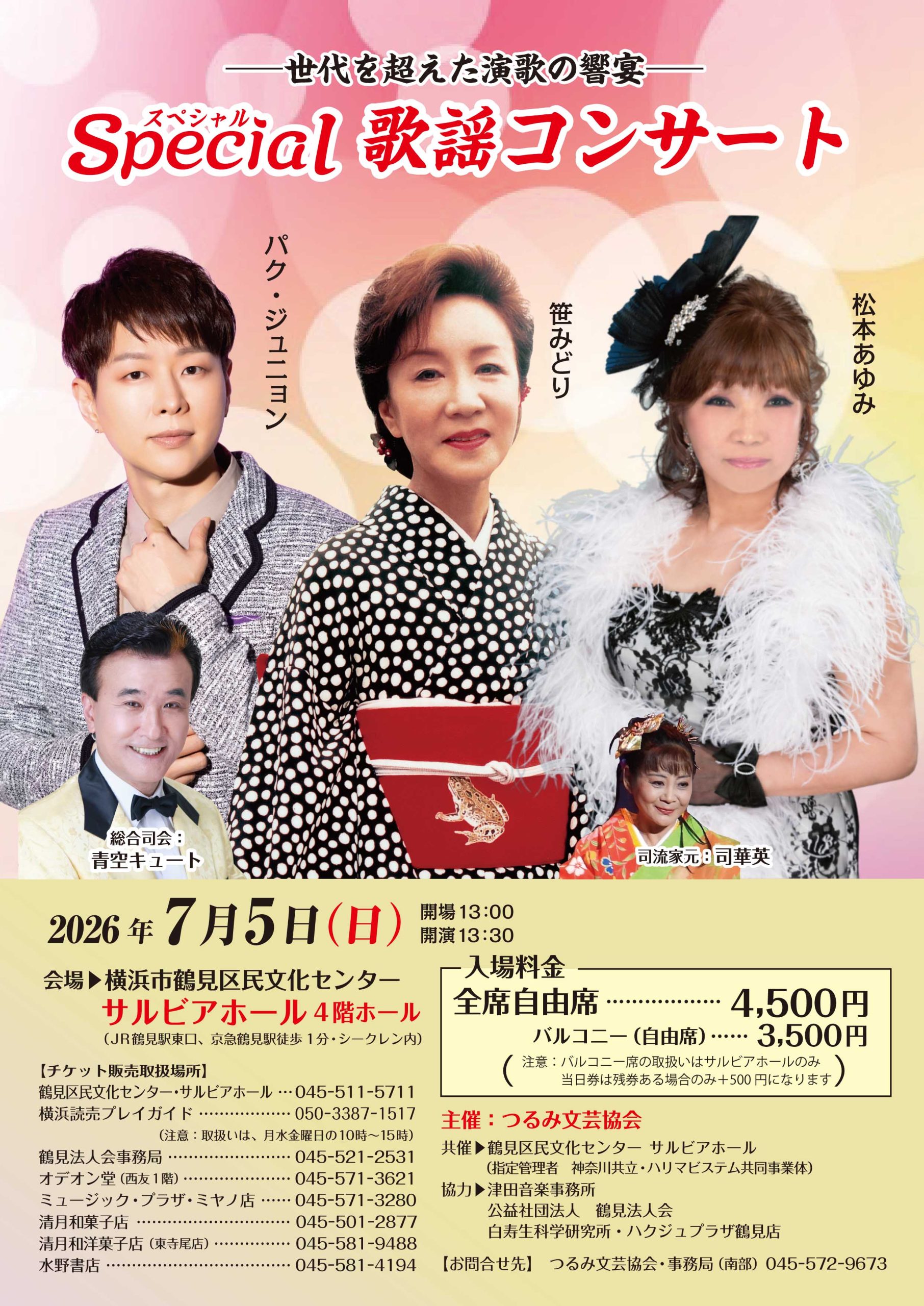 コンサート 落語 演劇 ダンス その他 公演・イベントの一覧 2026年3月23日(月) 横浜市立東高等学校吹奏楽部第48回定期演奏会 日時 開場 18時00分 開演 18時30分 終演予定 20時30分 入場料 入場無料 会場 4階ホール 2026年3月23日(月) サルビアホール共催 Salvia-hall Quartet Series Season64 クァルテット・エクセルシオ 日時 開場 18時30分 開演 19時00分 終演予定 21時00分 入場料 全席指定 4公演セット券:21,000円 1回券:6,000円 会場 3階音楽ホール 2026年3月24日(火) 鶴見de古楽 ムジカ・レセルヴァータ 「ブリテンの地に華咲く調べ」 日時 開場 18時30分 開演 19時00分 終演予定 20時45分 入場料 自由席 前売一般 4200 円 ペア 7700 円 チケットレス・事前振込・完全予約制 会場 3階音楽ホール 2026年3月24日(火) ヨコハマ鶴見歌まつり 日時 開場 11時30分 開演 12時00分 終演予定 19時00分 入場料 自由席 前売:一般4,000円 当日バルコニー:1,500円 会場 4階ホール 2026年3月26日(木) 第7回パンフルートのびのびコンサート 日時 開場 13:40 開演 14:00 終演予定 16:00 入場料 自由席 無料 会場 3階音楽ホール 2026年3月27日(金) 響きの扉 ~3人が開く音の世界~ 日時 開場 18時30分 開演 19時00分 終演予定 21時00分 入場料 自由席 入場無料カンパ制 入場自由 会場 3階音楽ホール 2026年3月28日(土) MuSICA Vol.10 Anniversary! 日時 開場 18時30分 開演 19時00分 終演予定 21時00分 入場料 自由席 前売/当日 一般 4000 円 会場 3階音楽ホール 2026年3月28日(土) ミュジカポール・コンサート19 日時 開場 13時40分 開演 14時00分 終演予定 16時20分 入場料 自由席 一般 2,000円 ご来場3回目ごとに1,500円 会場 3階音楽ホール 2026年3月29日(日) 交響楽団魁 第10回室内楽演奏会 日時 開場:13時30分 開演:14時00分 終演予定:16時00分 入場料 自由席 無料 入場自由 会場 4階ホール 2026年3月30日(月) 鶴見ひるま寄席 日時 開場 13時45分 開演 14時00分 終演予定 16時00分 入場料 自由席 一般 2,000円 会場 3階音楽ホール 2026年3月31日(火) ミュリール四重奏団 春への扉〜古典からロマンへ 日時 開場 14時30分 開演 15時00分 終演予定 17時00分 入場料 自由席 一般:前売3,000 円/当日3,500 円 会場 3階音楽ホール 2026年4月1日(水) うたごえ楽校 日時 【午前】 開場 10時30分/開演 11時00分/終演予定 13時00分 【午後】 開場 13時30分/開演 14時00分/終演予定 16時00分 入場料 自由席 当日一般 700 円 体験 1000円(1回限り) 会場 3階音楽ホール 2026年4月1日(水) 横浜歌声の会「涼風」 日時 開場 13時00分 開演 13時55分 終演予定 16時00分 入場料 自由席 一般:前売2,500円/当日3,000円 団体:2,000円 会場 4階ホール 2026年4月2日(木) イエスの死を記念する集まり 日時 開場 18時30分 開演 19時30分 終演予定 21時00分 入場料 入場無料 関係者限定 会場 3階音楽ホール 2026年4月8日(水) ~2026年4月9日(木) 長谷川 伸シリーズ 舶来巾着切 日時 開場 12時30分 開演 13時00分 終演予定 16時30分 入場料 自由席 一般:前売 3,500円/当日 4,000円 会場 3階音楽ホール 2026年4月10日(金) 鶴見de古楽 トリオ・シークレイン リコーダートリオの愉しみ 日時 ① 開場 13時30分 開演 14時00分 終演予定 15時45分 ② 開場 18時30分 開演 19時00分 終演予定 20時45分 入場料 自由席 一般: 4,000円 ※チケットレス・事前振込・完全予約制 会場 3階音楽ホール 2026年4月10日(金) 夢グループ応援 韓流コンサート 日時 開場 13時30分 開演 14時00分 終演予定 未定 入場料 全席指定 一般:6,000円 会場 4階ホール 2026年4月12日(日) 鶴見室内管弦楽団 第16回定期演奏会 日時 開場 13時20分 開演 14時00分 終演予定 16時00分 入場料 自由席 一般 :1,000円 会場 4階ホール 2026年4月13日(月) 昭和の名曲コンサートvol.3〜歌でめぐるあの頃へ〜 日時 開場 12時30分 開演 13時00分 終演予定 14時30分 入場料 自由席 一般:前売 2,500 円/当日 3,000 円 学生:前売1,000円/当日1,500円 会場 3階音楽ホール 2026年4月13日(月) GREEN×EXPO 2027 ボランティア募集相談会 日時 開場:18時30分 開演:19時00分 終演予定:21時00分 入場料 無料 自由席 要事前申込 会場 3階音楽ホール 2026年4月19日(日) 阿部知里&岩﨑舞 Duo Recital vol.2 日時 開場 13時30分 開演 14時00分 終演予定 16時00分 入場料 自由席 一般:2,500円 学生:1,000円 未就学児:800円 会場 3階音楽ホール 2026年4月20日(月) 世界の名曲、抒情歌、唱歌、童謡をピアノ伴奏で歌いましょう 日時 開場 13:30 開演 14:00 終演予定 16:00 入場料 自由席 一般:1,000円 会場 3階音楽ホール 2026年4月21日(火) 榛葉樹人&吉田幸央コンサートツアー2026 日時 開場 13時00分 開演 13時30分 終演予定 15時30分 入場料 自由席 一般:4,000円 会場 3階音楽ホール 2026年4月24日(金) サルビアホール共催 Salvia-hall Quartet Series Season64 クァルテット風雅 日時 開場 18時30分 開演 19時00分 終演予定 21時00分 入場料 全席指定 4公演セット券:21,000円 1回券:4,500円 会場 3階音楽ホール 2026年4月24日(金) ~2027年4月26日(月) G/9-Project演劇公演2026【春】人魚の姫~泡になったaiの詩~ 日時 24日(金) ①開場:13時00分 開演:13時30分 ②開場:19時00分 開演:19時30分 25日(土) ①開場:13時00分 開演:13時30分 ②開場:17時00分 開演:17時30分 26日(日) 開場 :13時00分 開演: 13時30分 入場料 前売り