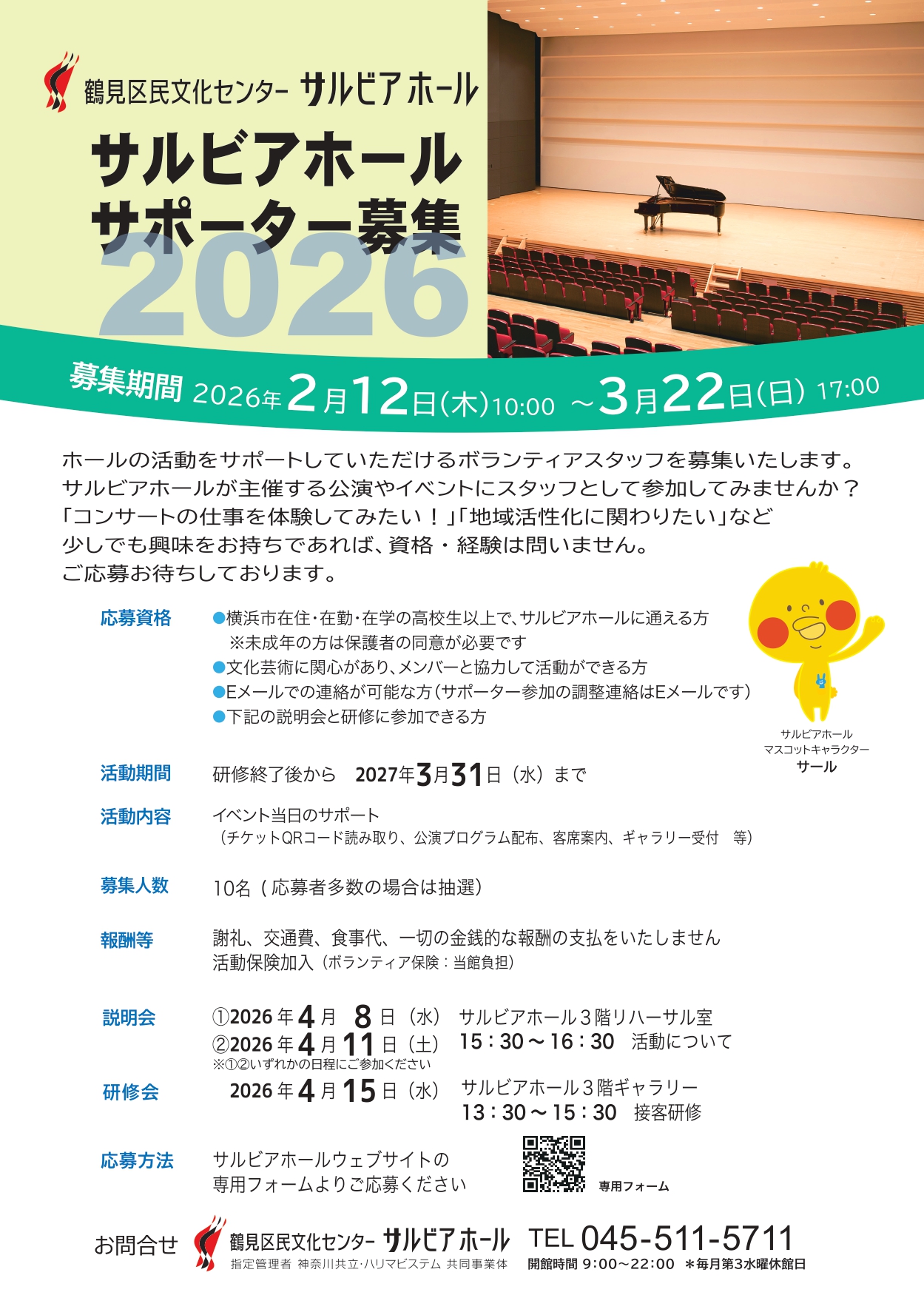 ホールの活動をサポートしていただけるボランティアスタッフを募集いたします。